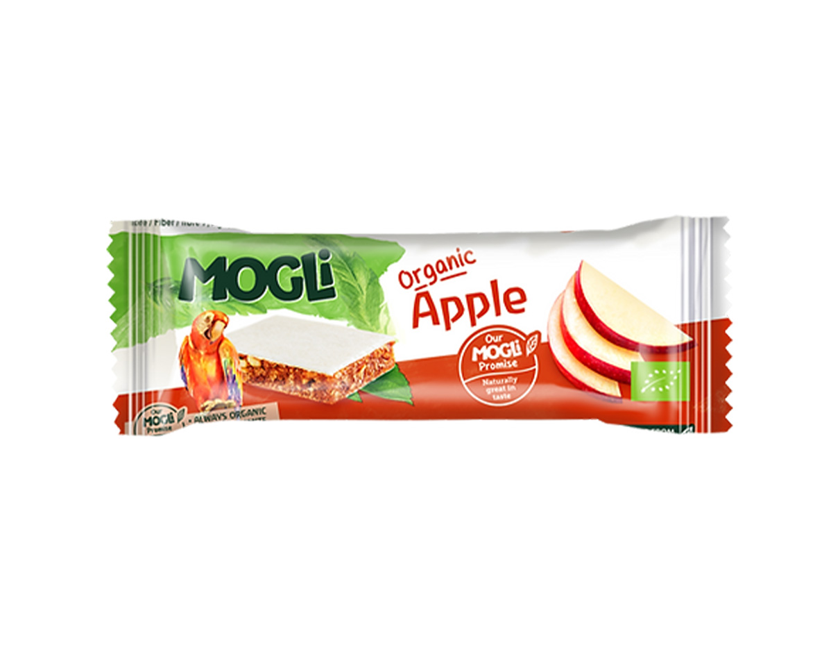 موغلي شريط التفاح العضوي. تفاح بالفواكه مع لوز محمص وقليل من القرفة بين رقاقات ويفر فاخرة. متعة طعمها طبيعي بكل بساطة. للجوع الصغير بينهما.