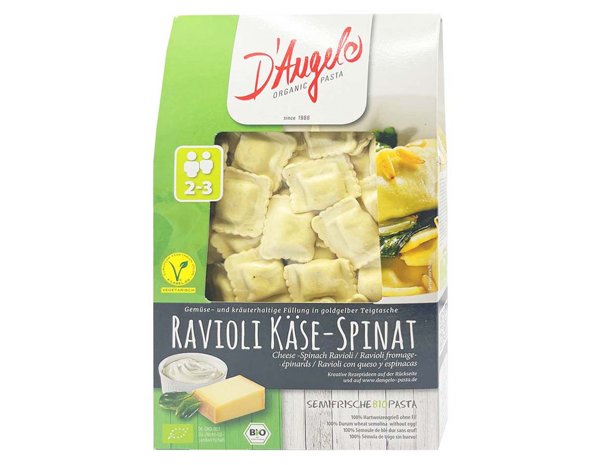 D’Angelo Organic Ravioli Cheese Spinach are made from durum wheat and refined with a filling of ricotta, mountain cheese and sheep cheese as well as spinach. A wonderful pleasure in best organic quality.