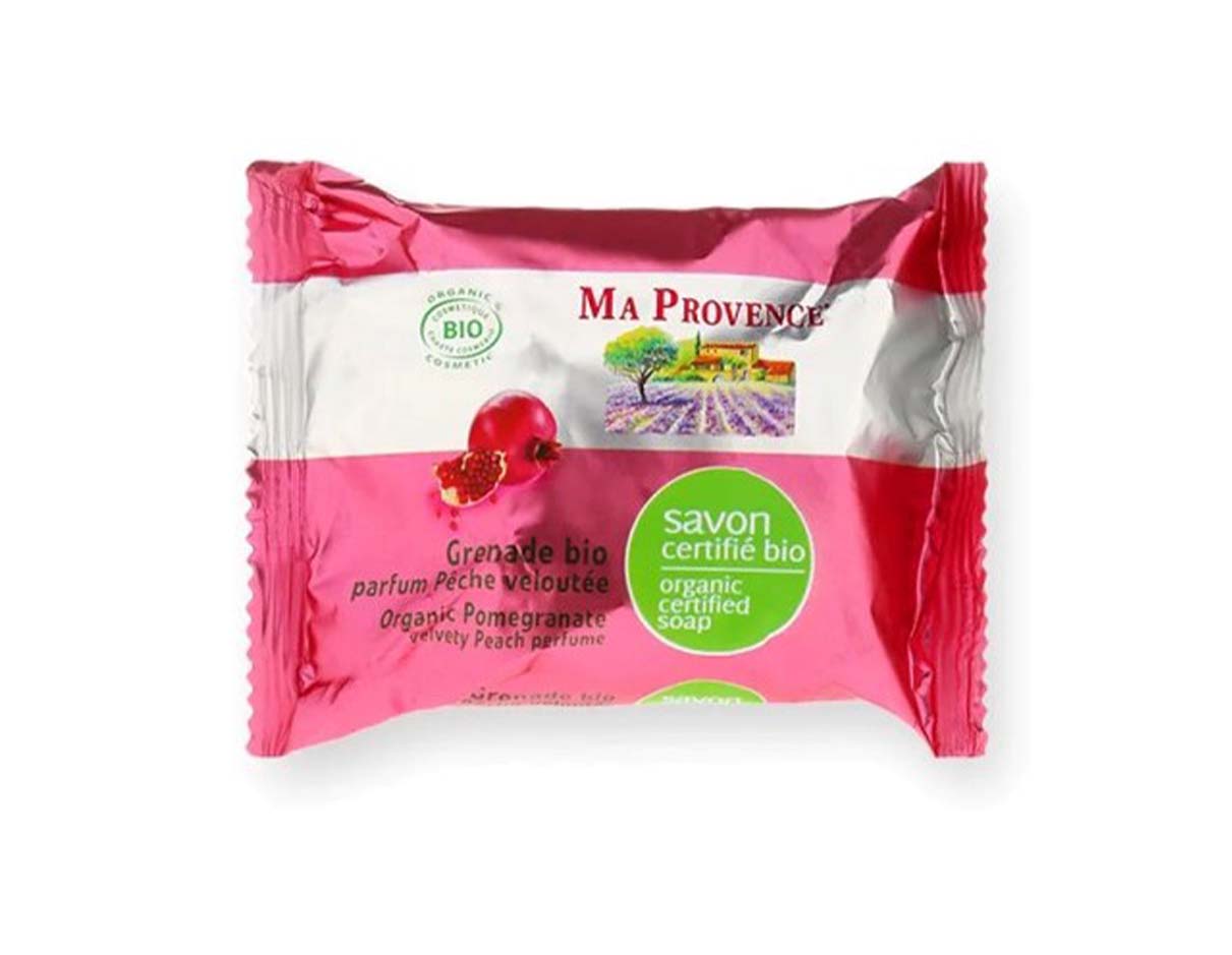 This organic soap offers the hydrating and toning properties of pomegranate with the fruity fragrance of peaches.