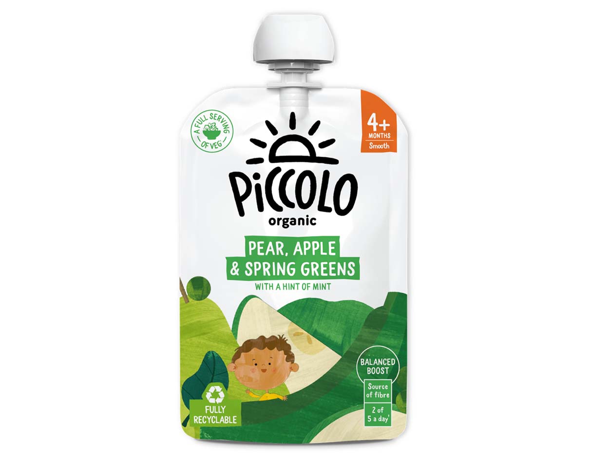 This smooth purée is a delicious combination of fresh ingredients, packed full of greens; creamy spinach and courgette with sweet peas and juicy apple and pear rounded off with a fresh zingy hint of mint.