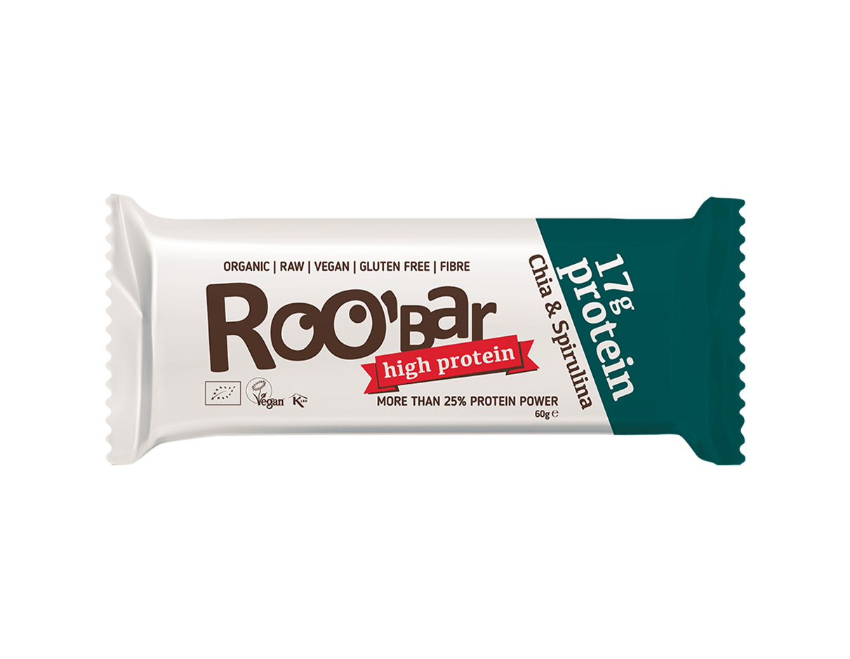 Nutritious snack for your workout! A Roobar with vegan protein, chia seeds & refreshing spirulina
